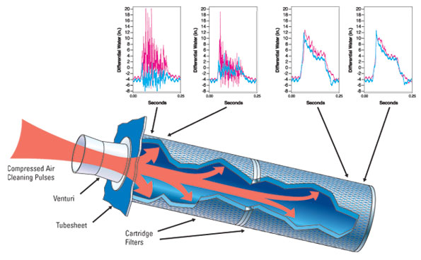 ExtraLife脈沖清灰系統(tǒng)采用專有的模擬脈沖清灰技術(shù)來設計,令粉塵可以輕松地從濾筒表面吹掉,從而提高過濾效率,延長濾材的使用壽命。圖中紅色曲線顯示ExtraLife系統(tǒng)在DFO前排濾筒產(chǎn)生的壓力增加。而藍色曲線則表示普通濾筒的脈沖反吹表現(xiàn)。