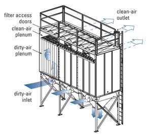 MB除塵器有兩種入口連接選擇:最常用的是塵斗進(jìn)氣口連接,含塵空氣會(huì)先撞在進(jìn)氣口的導(dǎo)流板上,較重的顆粒會(huì)因撞擊直接落入塵斗,因而減少了粉塵量,有效延長(zhǎng)了濾袋使用壽命和減低運(yùn)行壓差。 對(duì)于較輕或纖維性的粉塵,可以選用高位進(jìn)風(fēng)連接來(lái)避免除塵器內(nèi)的上升氣流速度影響清灰,令粉塵在脈沖清灰時(shí)可更有效地落入塵斗。